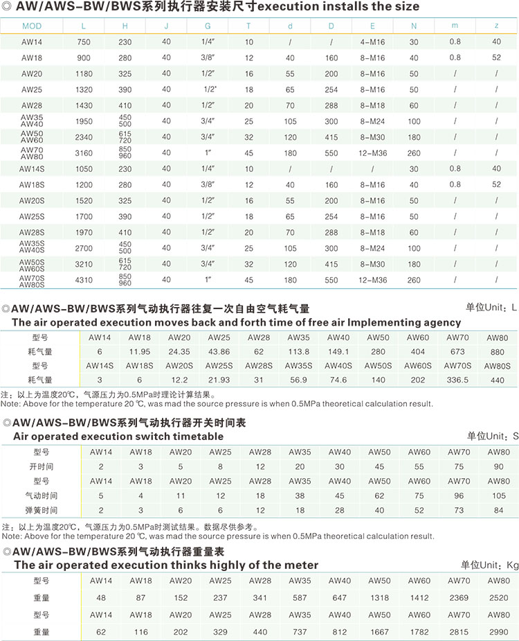 型號(hào)AWxx=雙作用式;型號(hào)AWxxS=單作用式(彈簧復(fù)位)。