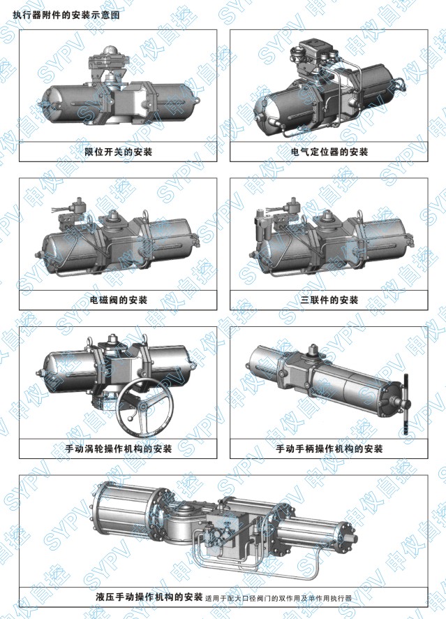 7、強大的附件功能:可配單(雙)電控電磁閥、限位開關(guān)回訊器、電氣位器、氣源處理三聯(lián)件以及手動操作機構(gòu),完全實現(xiàn)自動或手動控制。