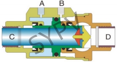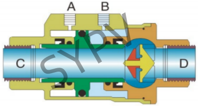 當(dāng)"A孔進(jìn)氣("B"孔排氣)時,活塞向"D口移動并壓在閥座密封上,此時閥門關(guān)閉。