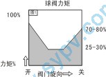 | 球閥 球閥的結(jié)構(gòu)原理基本上根據(jù)一個拋光球芯(包括通道)包夾在兩個閥座這間(上游和下游),球心的旋轉(zhuǎn)對流體進(jìn)行攔截或流過球芯,上游和下游的壓差產(chǎn)生的力使球芯緊靠在下游閥座(浮動球結(jié)構(gòu))。這種情況下操作閥門的力矩是由球芯與閥座、閥桿與填料相互摩擦所決定的。 如圖1所示,力矩最大值發(fā)生在出現(xiàn)壓差且球芯在關(guān)閉位置向打開方向旋轉(zhuǎn)時。 |
