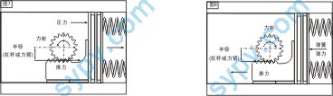 在彈簧復(fù)位的應(yīng)用中,輸出力矩是在兩個不同的操作過程中所得,(如圖7和8所示)。根據(jù)行程位置(0o和90o),每一次操作產(chǎn)生兩個不同的力矩值。彈簧復(fù)位執(zhí)行機(jī)構(gòu)的輸出力矩由力(空氣壓力或彈簧作用力)乘上力臂所得。